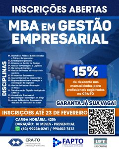 12% de desconto nas mensalidades, para os profissionais de Administração registrados no CRA-TO, e que estejam adimplentes. Whatsapp: (63) 3229-4591