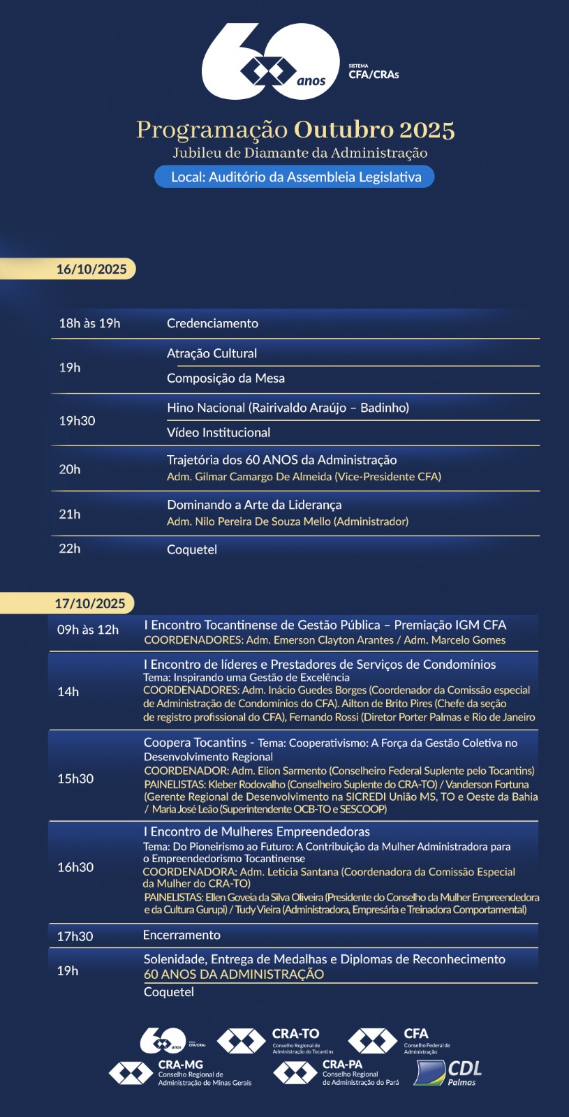 A contagem regressiva para o maior evento de Administração do Tocantins já começou. Liderança, gestão pública, cooperativismo, empreendedorismo e muitas homenagens.